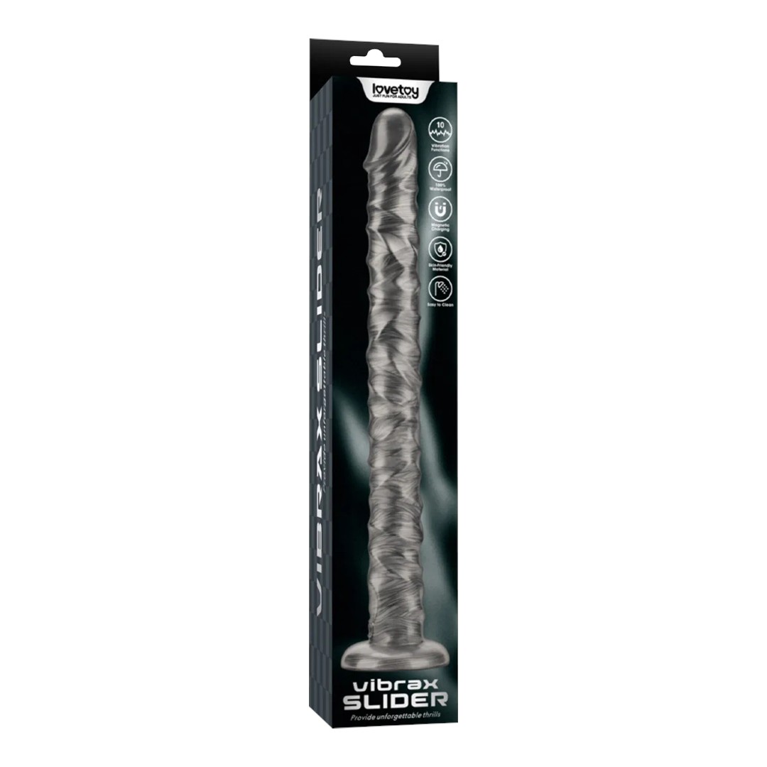 O Vibrax Slider King Sized da Lovetoy é um convite para mergulhar em uma jornada sensorial profunda e intensa. Com 40 cm de comprimento e estrutura flexível, essa prótese vibratória impressiona não só pelo tamanho, mas também pela potência e design provocante.